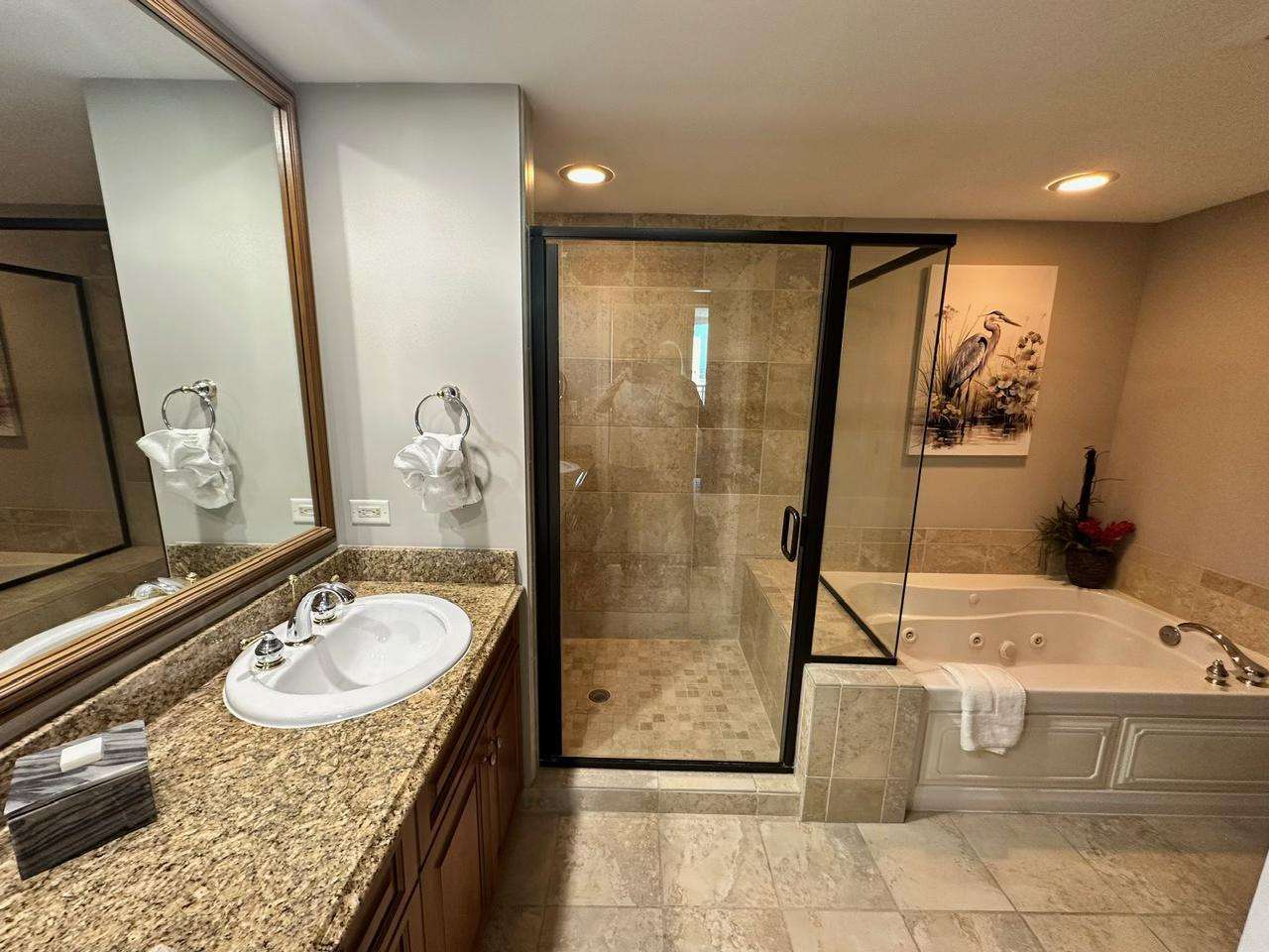 Bathroom includes a deep soaking tub and ceramic‑tiled shower surround