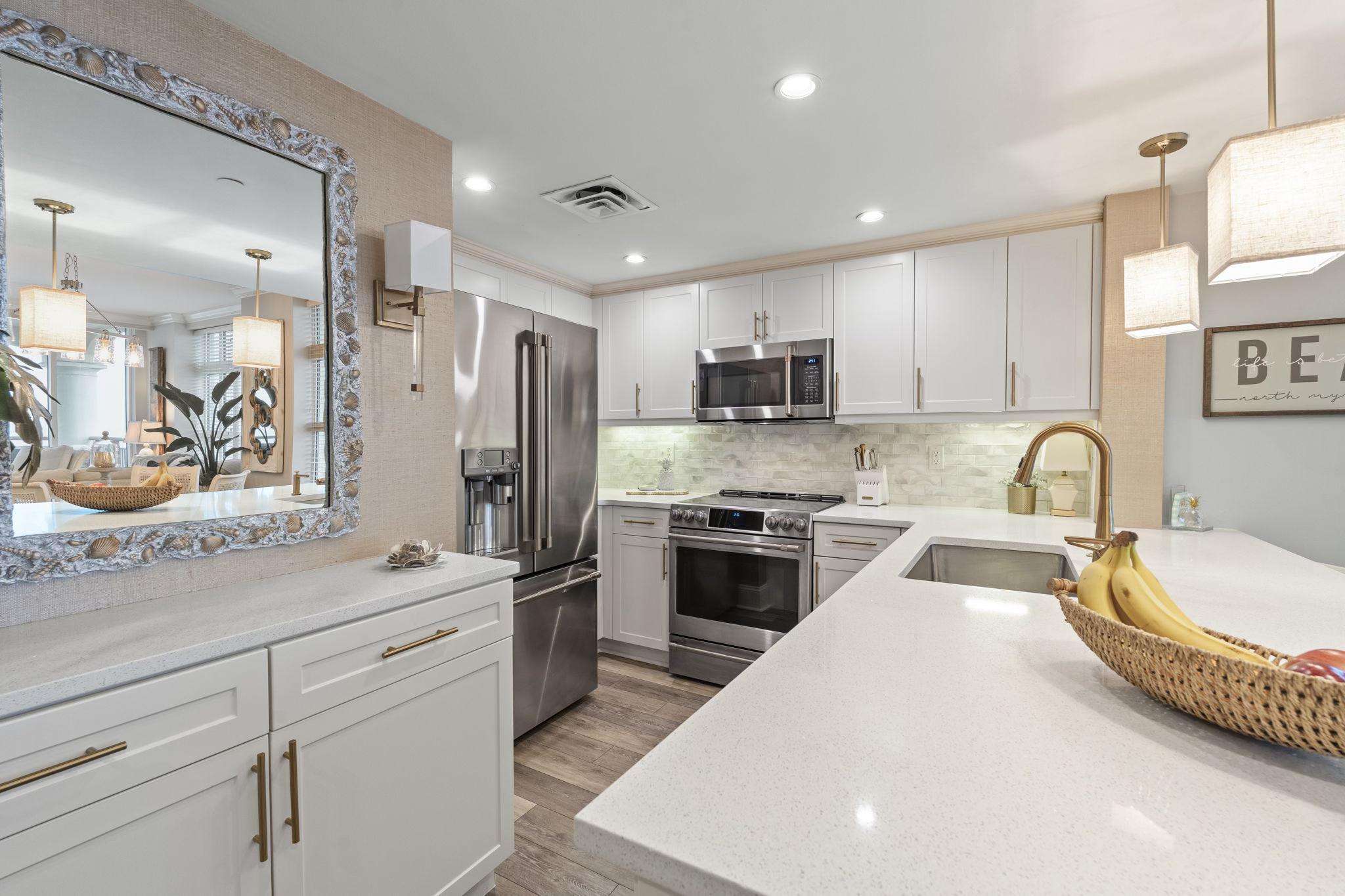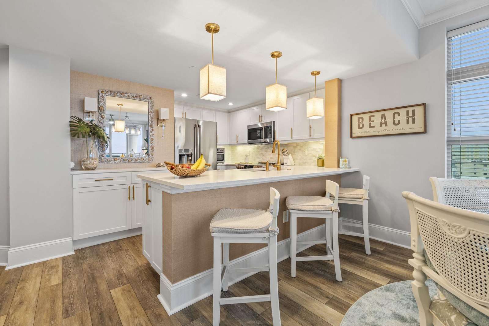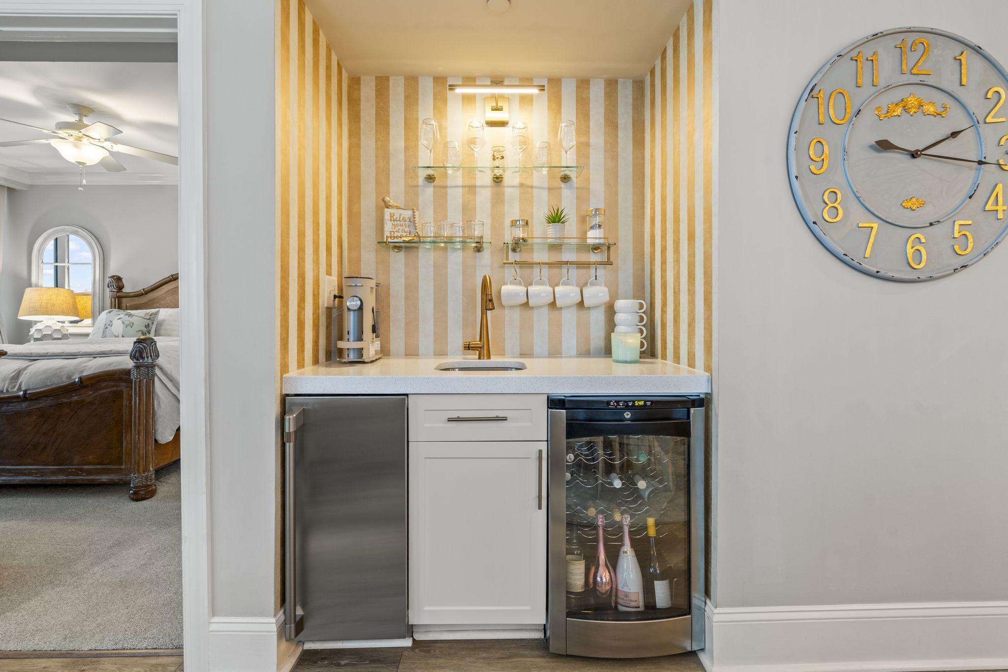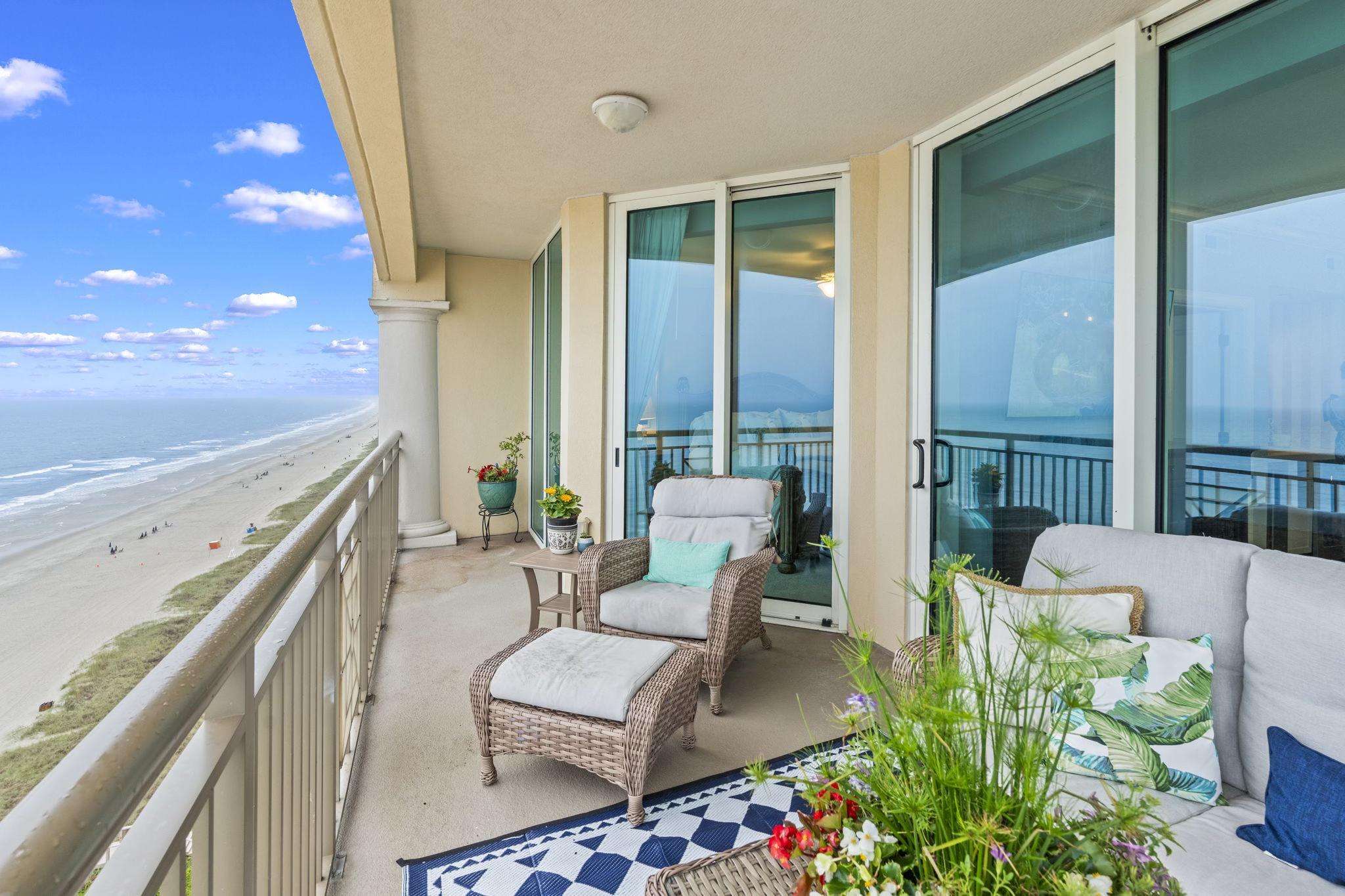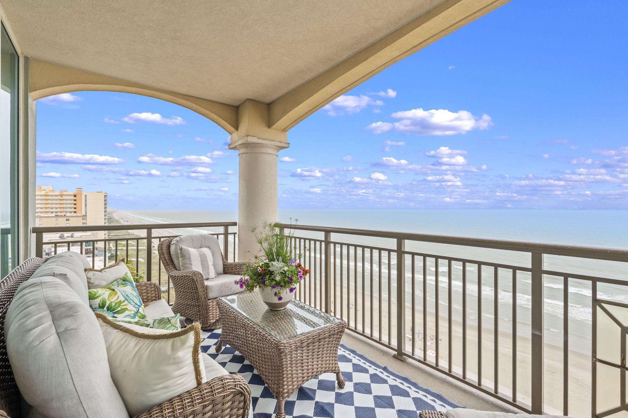 Escape to paradise in this luxury top-floor oceanfront penthouse at Mar Vista Grande, North Myrtle Beach. With 3 spacious bedrooms, 3 full bathrooms, and breathtaking corner views of the Atlantic from every room, this vacation rental is perfect for families, groups, or couples seeking a high-end beach getaway. Enjoy unmatched views and spacious comfort. Wake to ocean sunrises from every bedroom and enjoy expansive balcony sunsets. This beautifully furnished, open floor plan boasts 9-foot ceilings and a newly renovated fully equipped kitchen including quartz countertops, high end finishes, a coffee bar, and stainless-steel appliances. The spacious living room brings the outside in with expansive oversized windows from floor to ceiling. The custom crafted wine bar with ice machine makes for the perfect spot to fix a refreshing drink and relax.