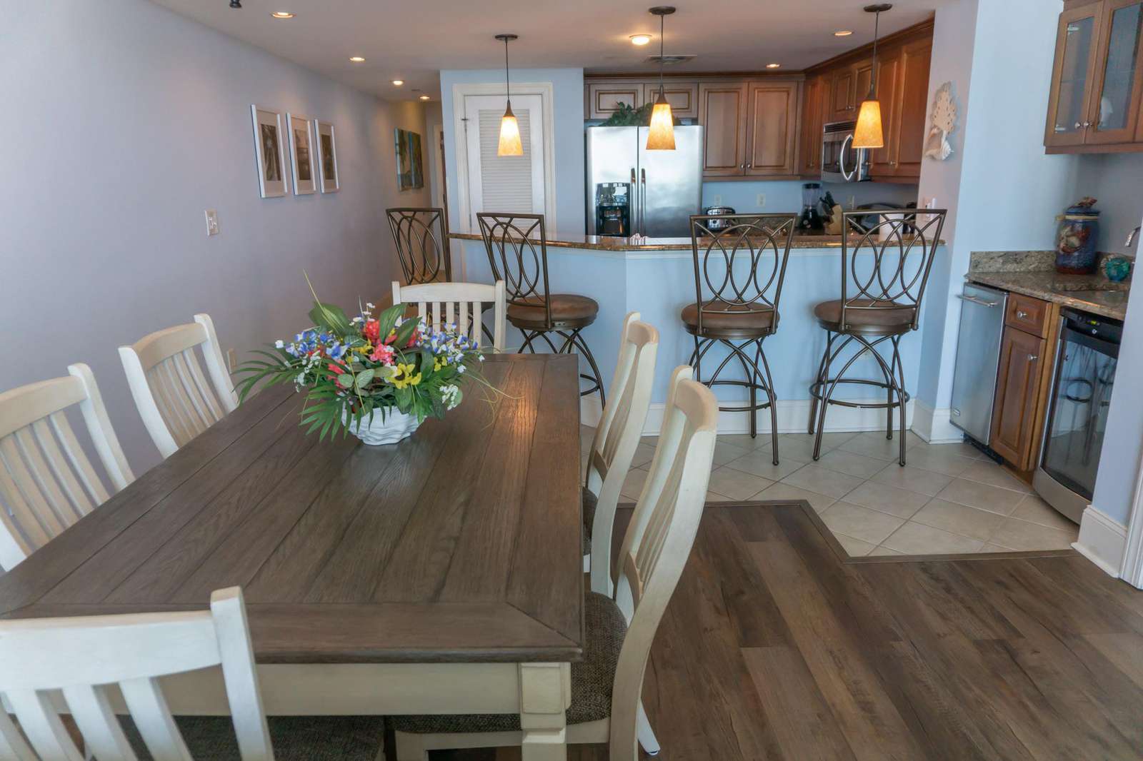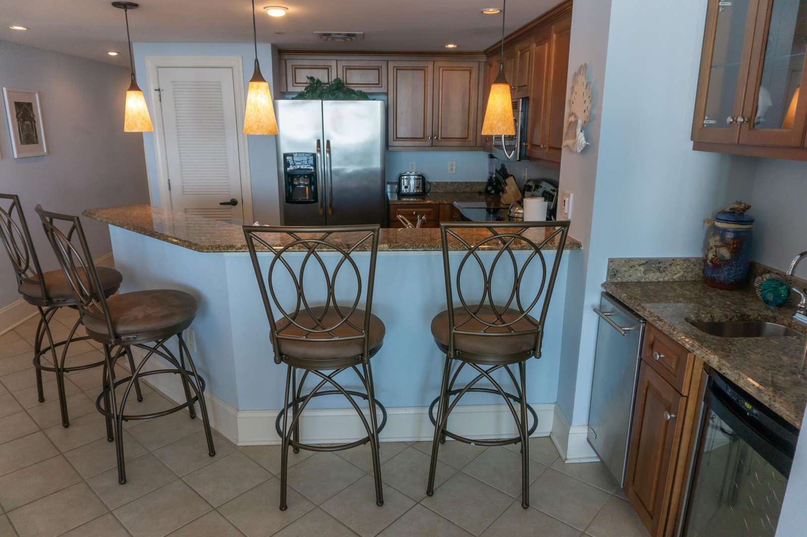 This beautifully furnished, newly updated, oceanfront, penthouse features 9' ceilings, wet bar, wine chiller exclusive to a penthouse unit. The master suite has direct oceanfront views and balcony access. The master bath includes double sinks, granite counter top, lighted vanity mirror, walk-in ceramic tiled shower with seat, whirlpool tub. The gourmet kitchen is fully equipped with a granite breakfast bar, seating, stainless steel appliances, full size stacked washer/dryer and more. Relax in the comfortable living or dining area featuring ocean front views, ceiling fan, huge flat screen TV, cable and wireless Internet. Guest bedroom two features two queens and guest bedroom three features two queens and private bath. The building amenities include heated and cooled enclosed hallways, four high speed elevators, a fifth floor state-of-the-art fitness center, indoor and outdoor pool areas with hot tubs and lazy river, private beach access, seasonal Tiki bar, four enclosed levels of parking and one traffic light from Main St. And the Highway 31 connector. Minutes from restaurant row, outlet shopping, world renown golf, water sports, and all the Myrtle Beach area attractions including Barefoot Landing.