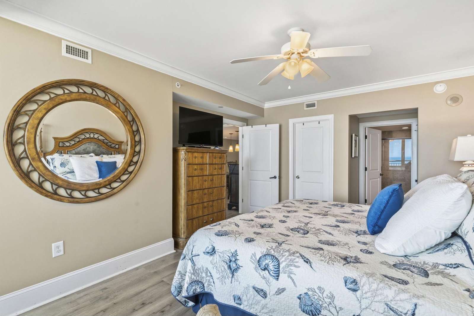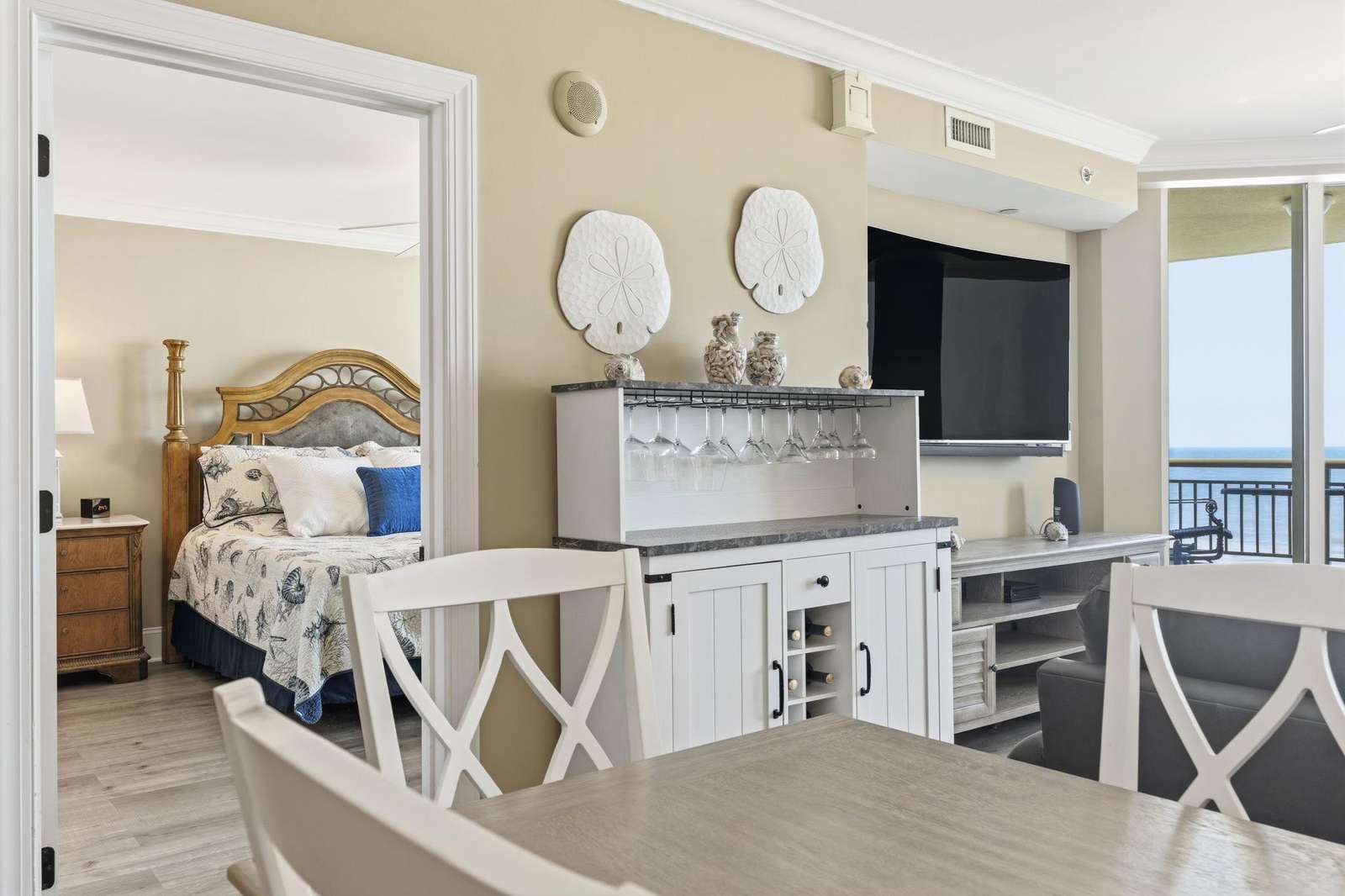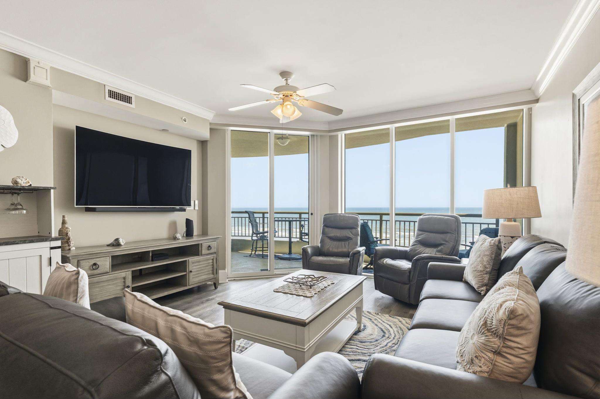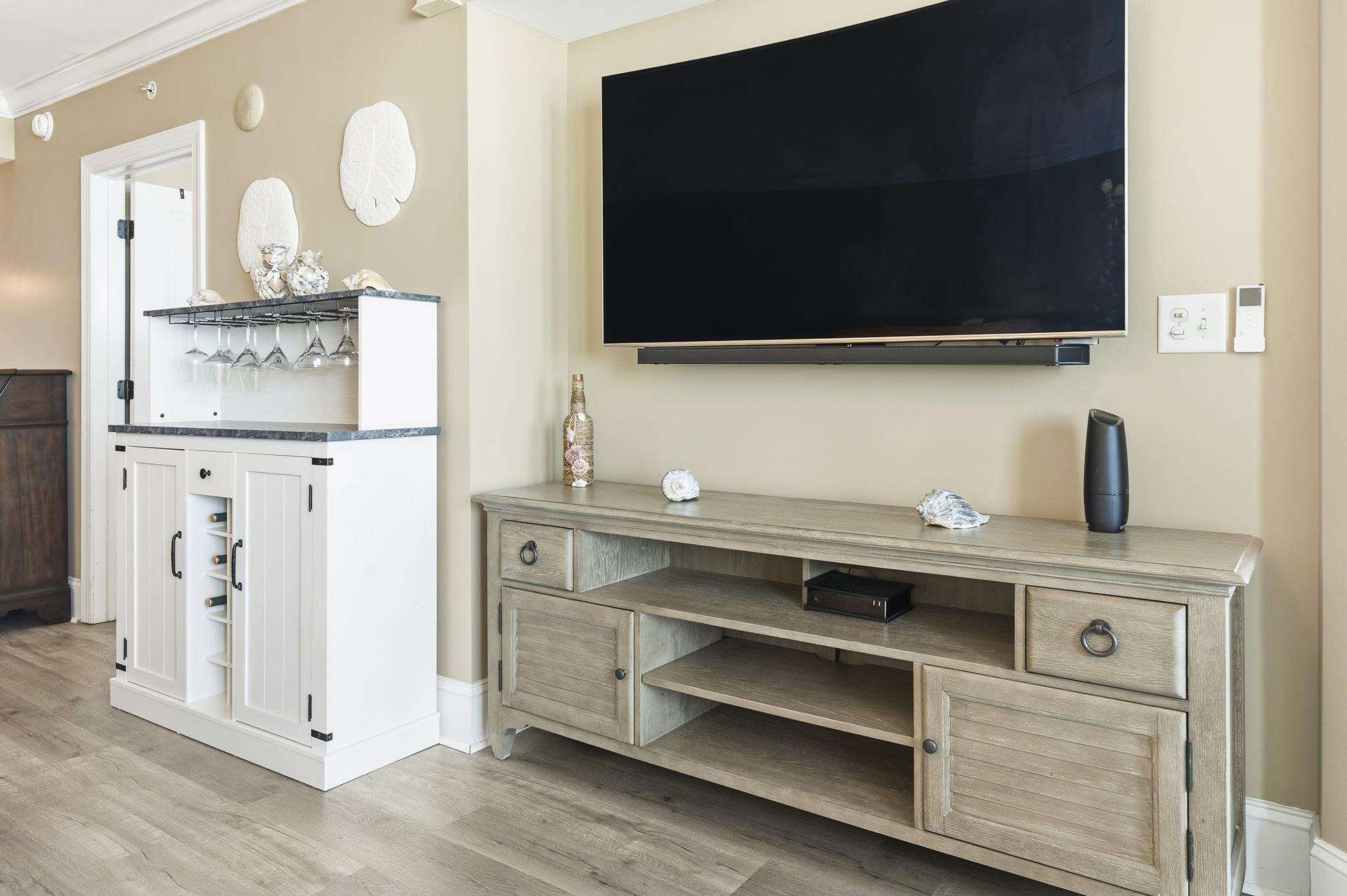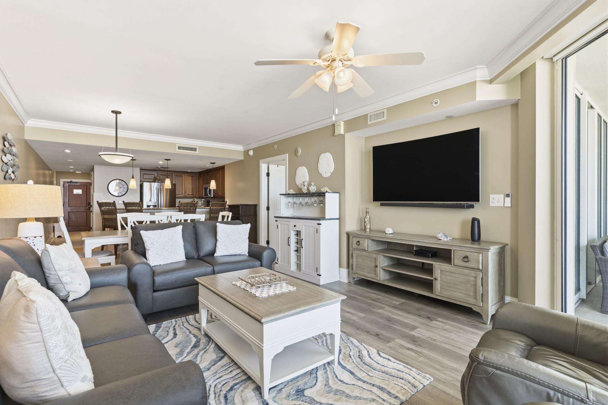 Entertainment & Comfort: Featuring upgraded high-speed internet, this unit is equipped with a 65” Samsung curved Smart TV in the living room and additional 50”/40” TVs in the bedrooms.