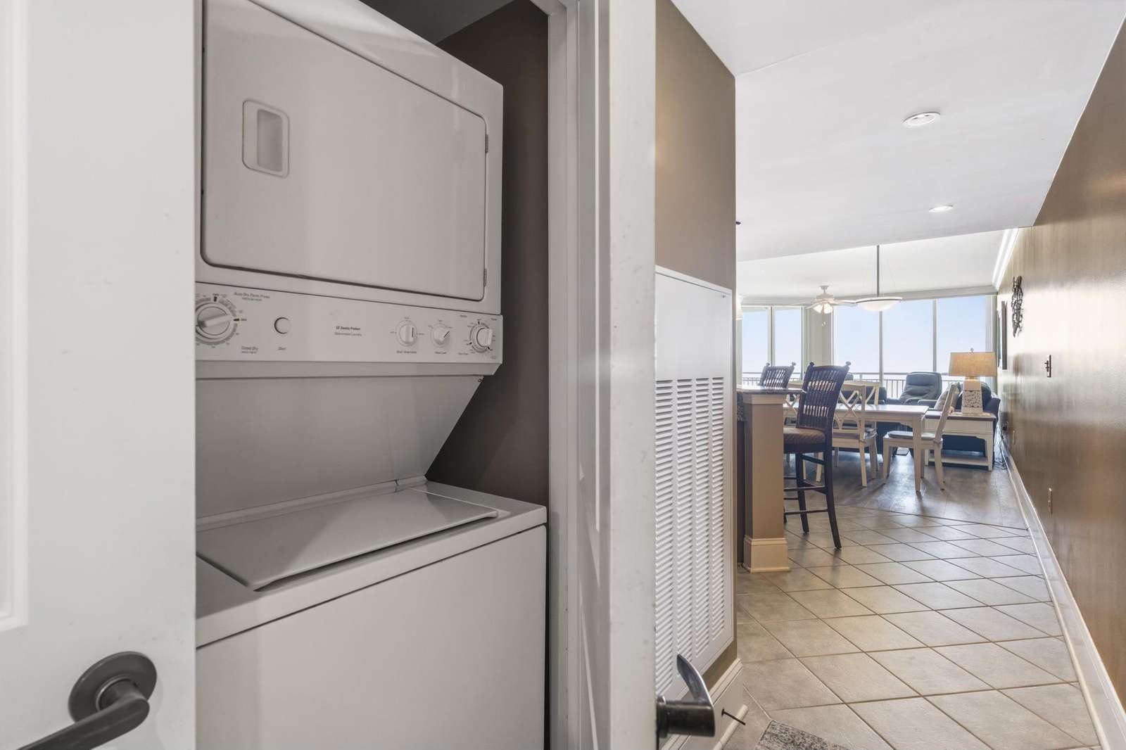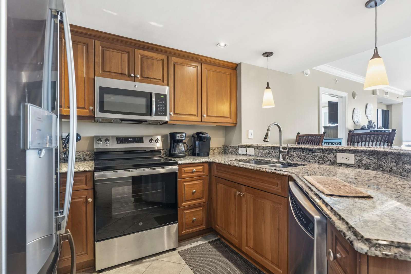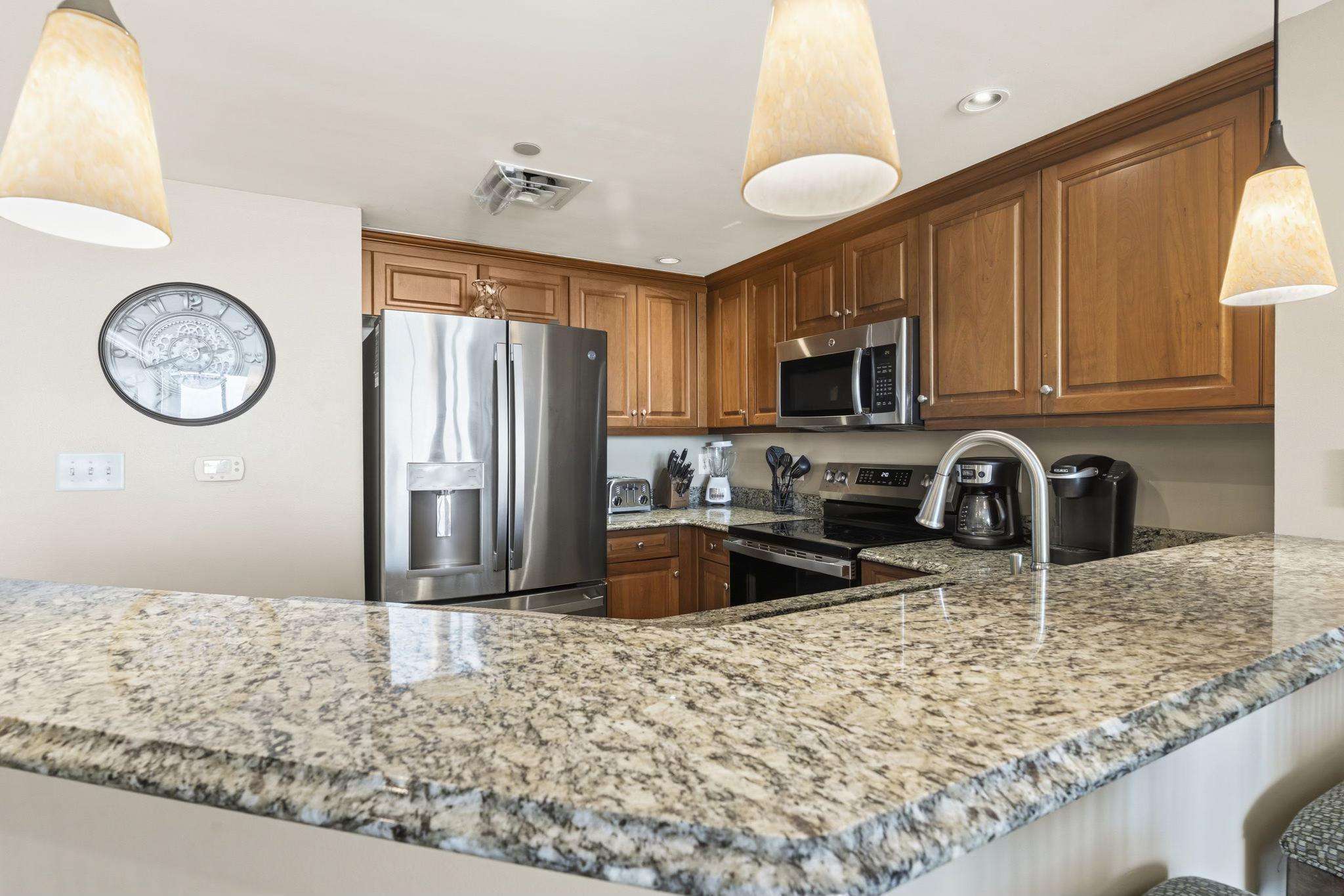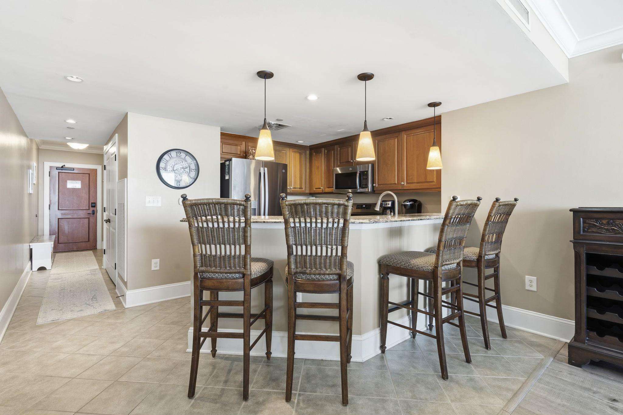 Gourmet Kitchen: Fully equipped with stainless steel appliances, granite breakfast bar, and a full-size stacked washer/dryer.