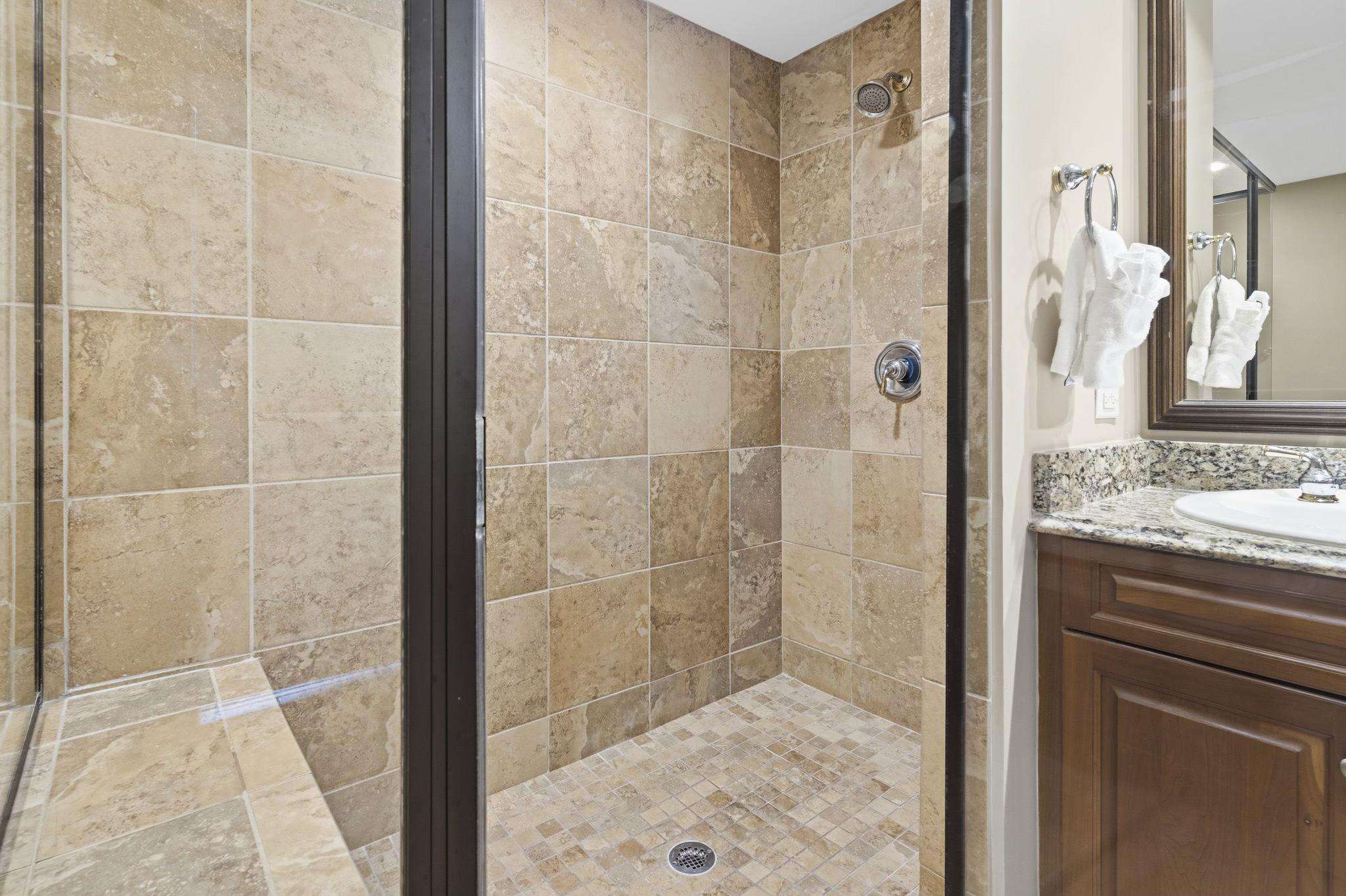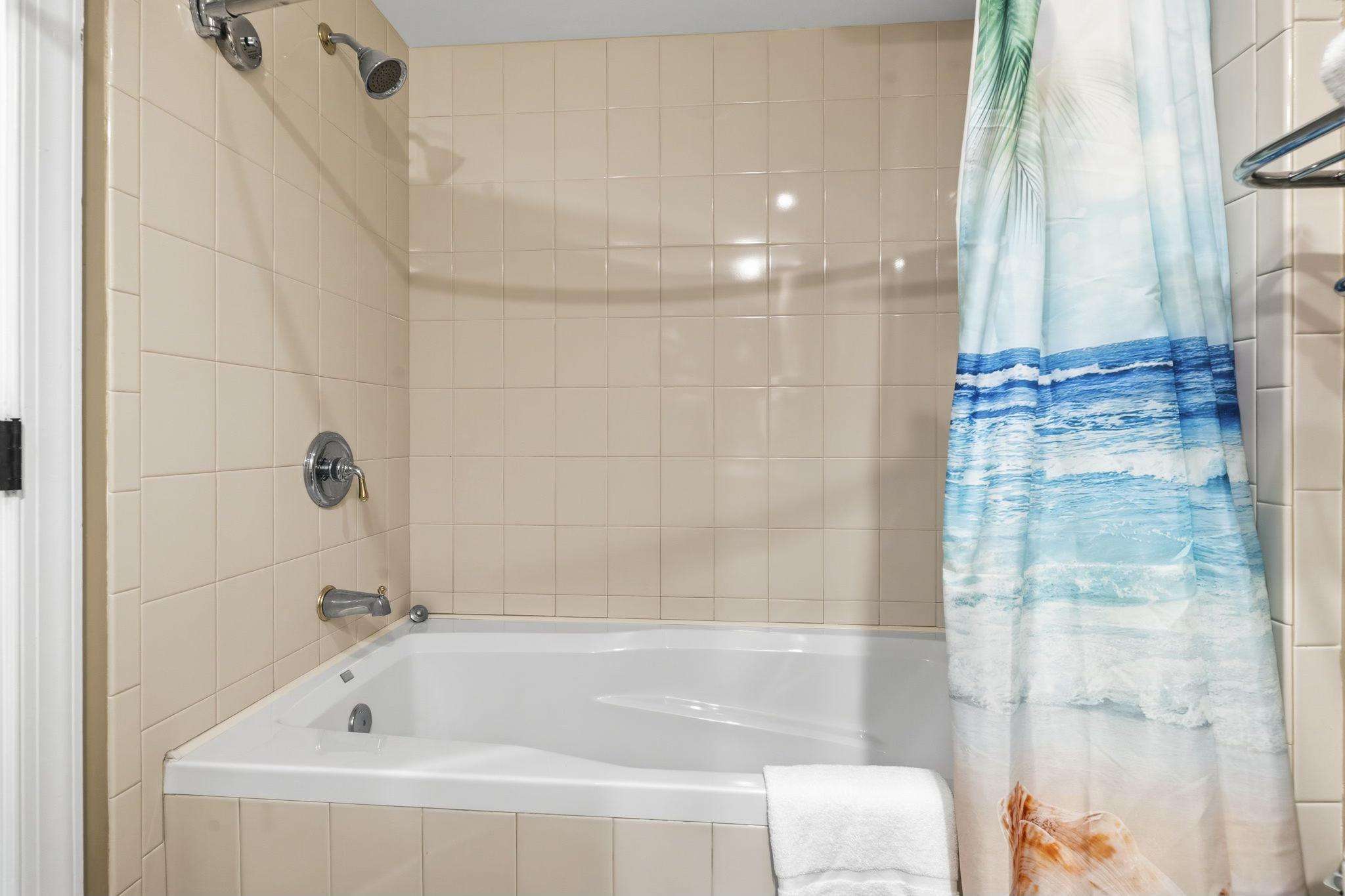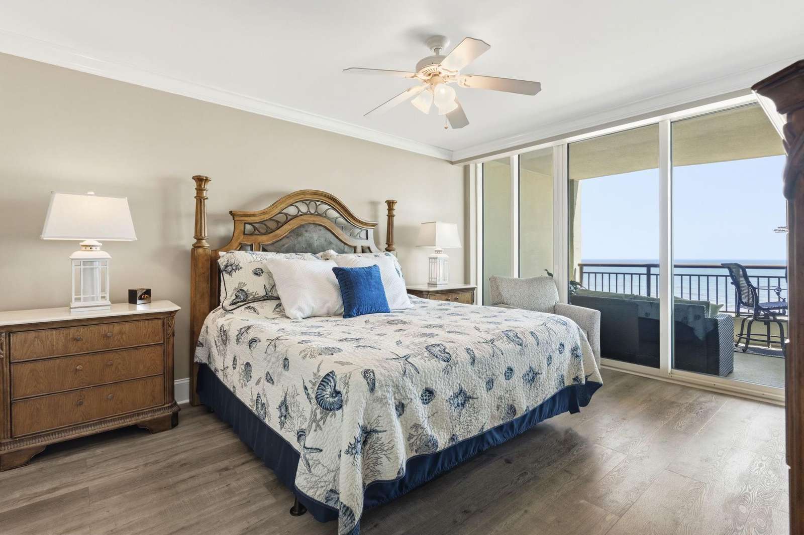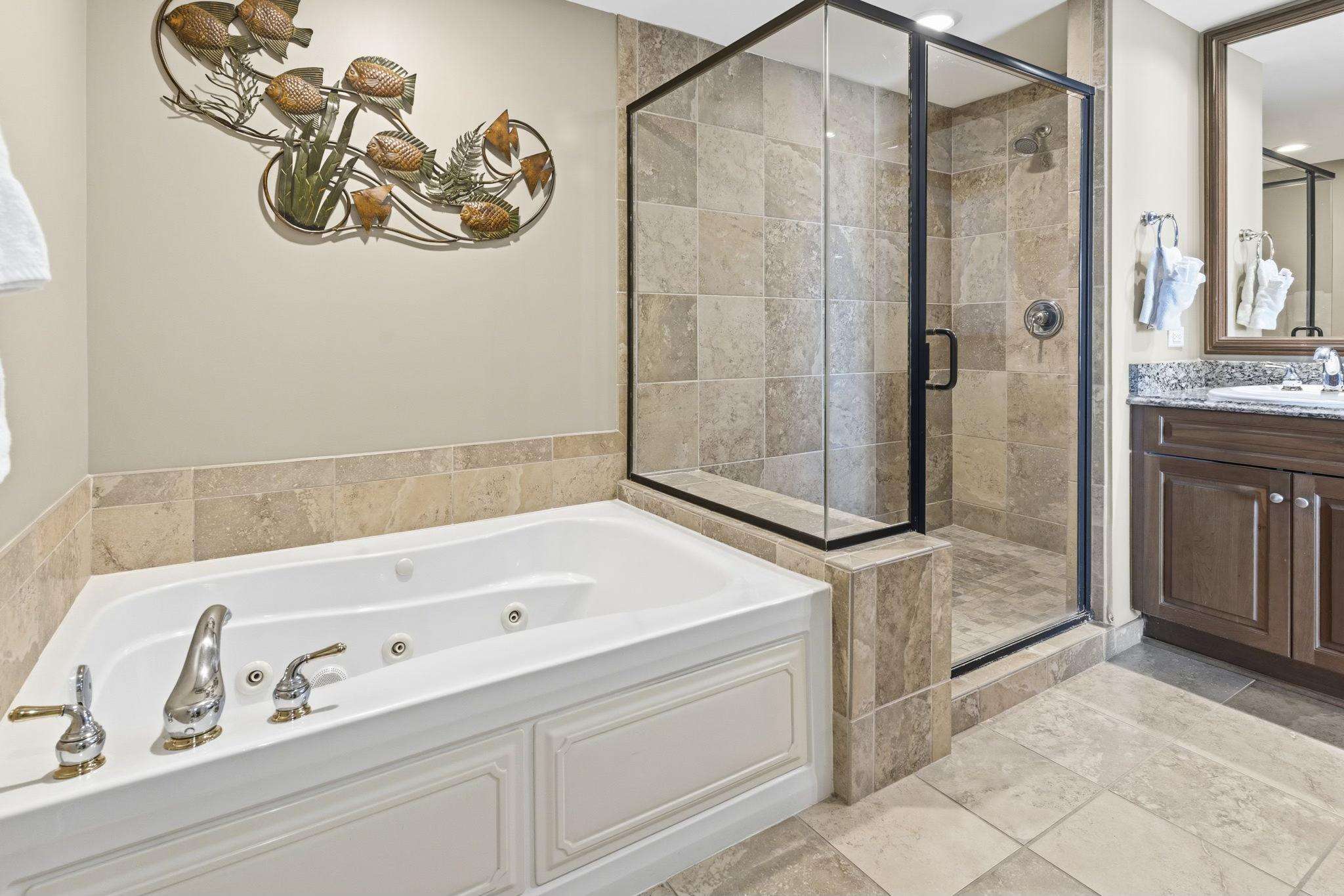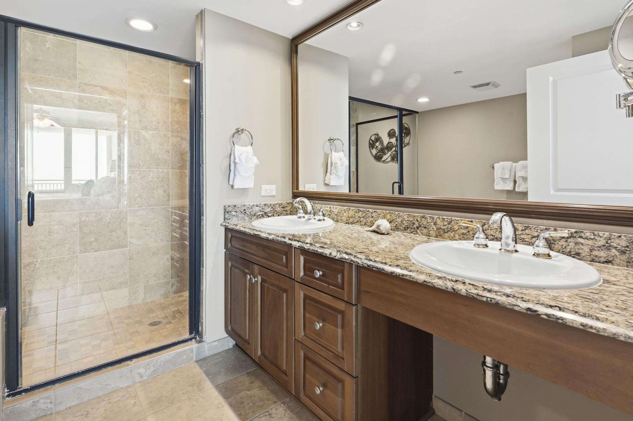 Master Suite: A private oceanfront sanctuary with balcony access and a spa-like ensuite featuring a walk-in tiled shower, whirlpool tub, and granite double vanities.